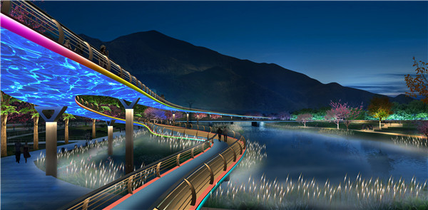 橋往往是處于城市的交通要道上,是城市景觀(guān)照明總體效果的重要部分。在橋梁區都要設置綠地、綠地對調劑橋區的景觀(guān)環(huán)境有重要的作用,應充分利用。從高視點(diǎn)觀(guān)賞立交橋全景圖案,既有車(chē)道邊線(xiàn)條輪廓,又有綠地內的燈光構圖和燈光雕塑,還有橋區內路燈形成的亮線(xiàn),這些燈光元素綜合在一起,形成一個(gè)有ji的整體畫(huà)面。